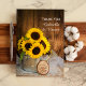 Send a warm message of thanks and appreciation for gifts received after a summer or fall rustic ranch theme engagement party, bridal shower or marriage with the charming Sunflowers and Garden Watering Can Wedding Flat Thank You Note. These country chic custom nuptial thank you notes feature a quaint digitally enhanced floral photograph of a bouquet of yellow sunflower blossoms in a silver metal watering can, white bridal veil, vintage lace trimmed linen handkerchief and natural wood slice with the word LOVE burned on it with a burlap and weathered brown barn wood background.