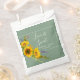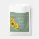 Pretty wedding favour bag features watercolor sunflower bouquet on basil green background with white customisable text blocks in modern fonts