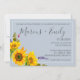 Pretty wedding invitation feature watercolor sunflower bouquet on "Plein Air" pale blue background with customisable text blocks in modern fonts and custom QR code on back.