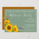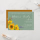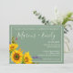 Pretty wedding invitation feature watercolor sunflower bouquet on basil green background with white customisable text blocks in modern fonts