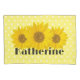 Three yellow sunflowers with custom name in a retro font on light yellow background with white polka dots.