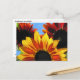 This postcard is full of brightness and cheer! Three brilliantly coloured sunflowers are illuminated by the sunlight streaming through the petals. The flowers display a gorgeous palette of gold, yellow, orange, red and brown. Green leaves and blue sky complete this composition of colour and form.