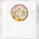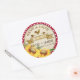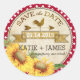 Sunflowers with red gingham check background and a rooster weather vane rustic country picnic save the date label design.