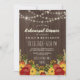 Rustic rehearsal dinner invitation with pale yellow text against a printed wood grain background, decorated with arrangements of sunflowers and deep red roses, wheat, berries, and green leaves, and rows of glowing string lights. Rehearsal dinner is written in a lovely calligraphy script, gently glowing yellow. The back features a warm yellow gingham pattern.