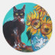 SUNFLOWERS WITH BLACK CAT IN BLUE TURQUOISE CLASSIC ROUND STICKER