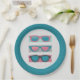 Fun hand illustrated art print featuring a trio of sunglasses in shades of pink, blue and grey sitting on distressed backgrounds. Surrounded by coordinating blue spot pattern. Great for a pool party, a barbeque or just a fun summer get together.