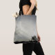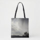 This tote bag features a photo that captures an evening landscape with the sun's rays breaking through the grey and white clouds. The land appears in black silhouette along with the branches of a distant tree. The sunbeams create diagonal lines across the two-tone sky. The same sky photo appears on both the front and back of this tote bag.