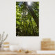 Sunlight filters through a dense forest canopy, illuminating layers of branches and leaves from below. The upward perspective captures the height and depth of the trees, creating a natural sense of immersion in the woods.