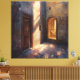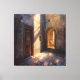 Step into the serene ambiance of Sunlit Courtyard, a fine art print capturing a tranquil stone passageway bathed in golden afternoon light. A rustic wooden door and arched entryway frame the scene, while warm sunlight spills across textured walls and a reflective stone floor. The interplay of light and shadow evokes a sense of timeless calm, making this piece ideal for cosy interiors, heritage-inspired decor, or spaces seeking warmth and quiet elegance.
