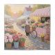 A charming European street glows in warm golden-hour sunlight on a cobblestone path. A woman in a brown apron arranges a vibrant bouquet beside her bicycle with a basket full of blooms, surrounded by overflowing displays of pink roses, tulips, peonies, and colorful flowers under pink-and-white striped awnings. This cheerful, nostalgic illustration radiates warmth, freshness, and joyful springtime vibes.