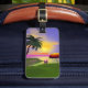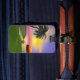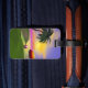 Luggage tag with my artwork of a tropical green island with a palm tree, colourful beach umbrella, beach ball and a yellow sun in the blue sky with a touch of pink in the horizon.