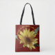 This tote bag features a large sunflower on a dark red background with text above stating "Look on the sunny side of life!". The image is from a pic I took last summer (2017) of a sunflower growing in my garden.