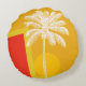 Cheerful round pillow done in a yellow and orange abstract sunrise looking background, with graphics of a white palm tree outline. Customise to add any text you want.