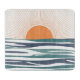 Abstract illustration of sunrise with orange sun and blue, white and turquoise sea waves decoration