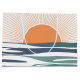 Abstract illustration of sunrise with orange sun and blue, white and turquoise sea waves decoration