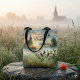 Sunrise Church with Birds in Misty Meadow Tote Bag