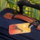 Colourful travel accessory with vintage walking giraffe illustration on beautiful watercolor African sunrise background. Coordinating accessories also available