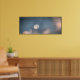 This poster features a full moon still shining in the sky at sunrise. The sky is getting light. The clouds are shades of pink and orange. The face of the moon is very visible. I digitally enhanced this original photograph to emphasise the dramatic feeling.