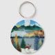 A beautiful landscape with unique colours and textures showing a mountain and lake landscape and multi-coloured forest with a rising sun and a moose in shades of blue, green, gold, and magenta.
