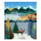 A beautiful landscape with unique colours and textures showing a mountain and lake landscape and multi-coloured forest with a rising sun and a moose in shades of blue, green, gold, and magenta.