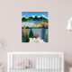 A beautiful landscape with unique colors and textures showing a mountain and lake landscape and multi-colored forest with a rising sun and a moose in shades of blue, green, gold, and magenta.