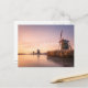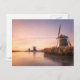 Photo postcard of a landscape with a row of three traditional windmills and reeds along a frozen river during a colourful sunrise in winter in Leidschendam in the Netherlands with a transparant box and the text 'Leidschendam, the Netherlands'.
