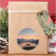 Round photo sticker of a colourful sunrise over Lake Bled with the island in the early morning in Slovenia.