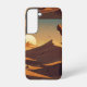 A minimalist illustration capturing the calm beauty of the desert at sunrise. Warm tones of gold and beige highlight the gentle curves of the sand dunes, creating a serene and peaceful scene."