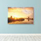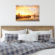 Canvas landscape print of a vibrant sunrise over a row of windmills and reflection in the water of the river on a beautiful morning in a countryside landscape in Kinderdijk in the Netherlands.