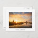 Photo postcard of a vibrant sunrise over a row of windmills and reflection in the water of the river on a beautiful morning in a countryside landscape in Kinderdijk in the Netherlands with a white border and the text 'Holland'.