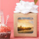 Square photo sticker with a vibrant sunrise over a row of windmills and reflection in the water of the river on a beautiful morning in a countryside landscape in Kinderdijk in the Netherlands.