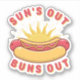 "Suns Out Buns Out" sticker, the perfect way to add some food pun humour to your life this summer! Featuring the cheeky phrase "Suns Out Buns Out" in bold letters, along with an adorable illustration of a hotdog nestled in a perfectly toasted bun, this sticker is sure to make you the centre of attention at any BBQ, picnic, or beach party. Grab your "Suns Out Buns Out" sticker and get ready to go crazy and stick these stickers on your water bottles,laptops and anywhere you feel fit.