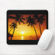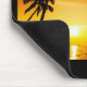 This mouse pad has a picture of a sunset and some palm trees on it.