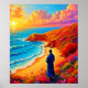 Lose yourself in the breathtaking beauty of this magical landscape painting. It captures a golden shore bathed in the warm, ethereal light of sunset, where pink and orange clouds drift over a vibrant blue ocean. This artwork perfectly evokes a feeling of peaceful solitude and wonder. While the initial concept was generated using cutting-edge AI, a skilled artist meticulously enhanced and refined every detail, ensuring its unique artistry and creative depth. This stunning collaboration delivers a truly exceptional piece. Ideal for bringing tranquillity and colour to any style. Don't wait—Place your order today and embrace the joy of owning this captivating seaside view!
