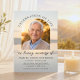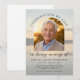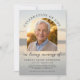 Beautiful sunset memorial photo card features easy personalization options for your loved one's picture in a modern arch frame, as well as name, date of birth/death, and celebration of life memorial details on a soft golden sunset background.