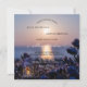 A wedding invitation featuring a sunset at the ocean with an artistic design lantern with sparkling lights. Beautiful for a coastal winter wedding.