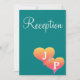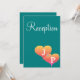 Pretty teal green wedding love design. Romantic double hearts wedding reception cards with two hearts on the front in sunset shades of golden yellow orange pink hues on a pretty teal green background with white text. Personalise Back of Reception cards with your Wedding details (type in place of my sample text). Insert the married couples last name monogrammed initial in elegant golden text. Original Artwork Design by TamiraZDesigns.