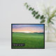 Postcard of a landscape with the rolling fields with green wheats at sunset in the Val d'Orcia valley in Tuscany, Italy with a black edge and the text: 'Tuscany'.