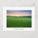 Postcard of a landscape with the rolling fields with green wheats at sunset in the Val d'Orcia valley in Tuscany, Italy with a white border and the text: "Tuscany".