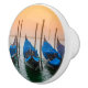 Peaceful setting next to the Doge's Palace in Venice, Italy, with four gondolas, all together pointing to a beautiful misty sunset.