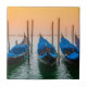 Peaceful setting next to the Doge's Palace in Venice, Italy, with four gondolas, all together pointing to a beautiful misty sunset.