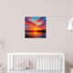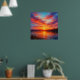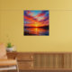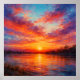 Artwork of a sunset over a calm lake. This artwork features vivid, painterly textures and a brilliant gradient sky ranging from deep purple to bright gold. The reflection on the water creates a peaceful, mesmerizing effect. With a symphony of fiery oranges, deep magentas, and calming indigos, the sky comes alive through dynamic, impasto-style brushstrokes. The vibrant colors are mirrored perfectly in the tranquil waters below, creating a sense of infinite depth and serenity. Delicate silhouettes of trees and shoreline grasses ground the composition, reminding us of the quiet beauty of nature. Perfect for a living room centerpiece or a bedroom sanctuary, this piece invites you to pause, breathe, and lose yourself in the glow of the setting sun.