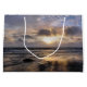 A photographic design of a soft dreamy sunset over the sea and reflected in the water one the beach. Wales.