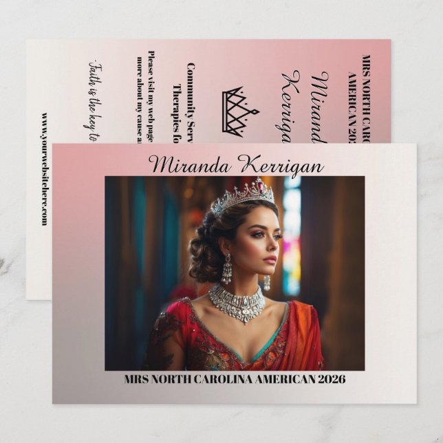 Take your pageant branding up a notch with this landscape designed pageant autograph card in rose gold ombre. These full colour cards feature space to place your photo on the front and back along with your name, pageant title, pageant platform, personal quote, message to followers, and website address or social media account. Upload your pageant headshot for the front and a fashion or personality photo on the back to achieve a distinctive look that will make you stand out from other contestants. Impress the pageant director, market yourself to potential sponsors, and look like a real pro with these custom pageant autograph cards from Pageant Printables.