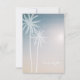 A unique beach wedding rsvp featuring an illustration of two white palm trees at left over a sunset background.