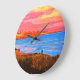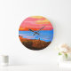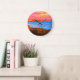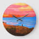 This wall clock contains a stylised image of a coastal sunset in Santa Cruz, California in hues of pink, purple, orange, and blue.