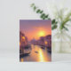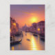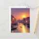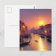 Stunning AI generated digital art postcard features a Venice scene with beautiful sunset on boats and homes in one of the city's canals.