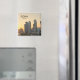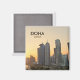 Square souvenir fridge magnet with the skyscrapers in the skyline of the commercial centre of Doha, the capital of the Arabian Gulf country Qatar at sunset and the text: 'Doha, Qatar'. A great souvenir!