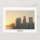 Postcard of the skyscrapers in the skyline of the commercial centre of Doha, the capital of the Arabian Gulf country Qatar at sunset with a white border and the text: 'Qatar'.