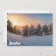 Sunset over frozen snowy forest near sea
